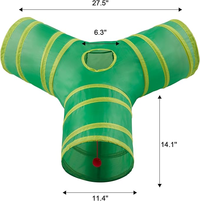 - SIZE AND MATERIAL: The 3 way cat tunnel expands to about 11”(27.94cm) tall x 19” (48.26cm) long and folds down to a fraction of that size.Include 1pcs cat tunnels.This cat tunnel is made of Nylon for indoor cats. Nylon wrapped around a sprung-steel frame.With an interior diameter of 11 inches.