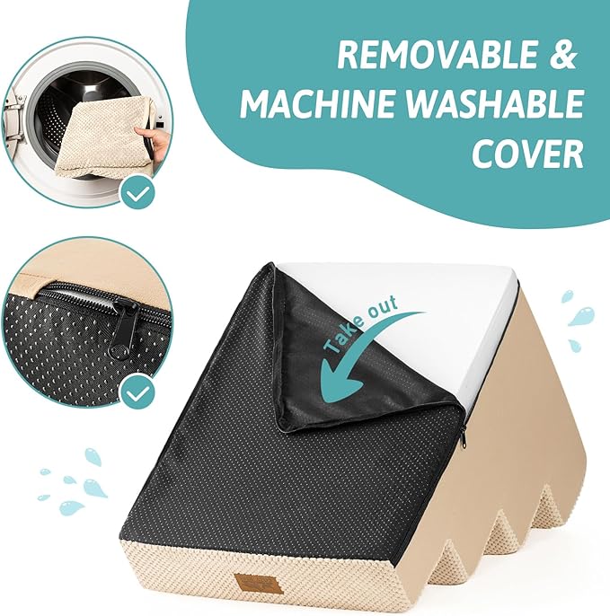 - Non-Slip Base and Removable Cover: Our dog steps for beds are equipped with a non-slip base featuring rubber dots for extra grip, minimizing movement during use. The pet steps cover is waterproof inner side, so you don’t have to worry about stains seeping into the foam. The outer cover is removable and machine washable for easy cleaning