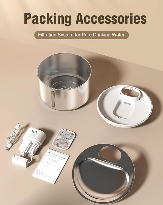 - Easy to Clean & Disassemble: The cat water fountain stainless steel features a removable tank design that is very easy to clean, quick refills and filter changes, you can spend less time cleaning and more time enjoying moments with your furry friend. *NOTE: Don't immerse the battery compartment in water*