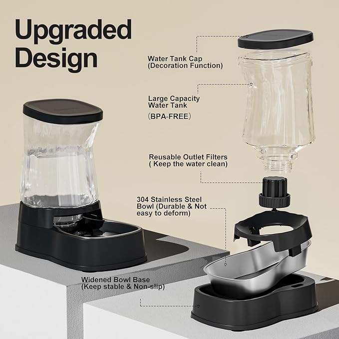 - 【Easy to Clean】- The split design makes it very convenient to disassemble the various components of this automatic water dispenser. The water tank and base can be easily separated, and each corner can be cleaned. It is recommended to clean once a week.(Note: The stainless steel bowl is dishwasher safe. But plastic tank cannot be used in dishwashers and need to be kept away from high temperatures to avoid damage.)