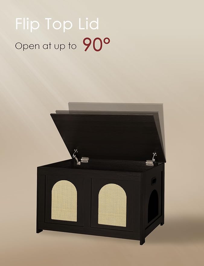 - 【Sturdy, Great Capacity】The enclosed litter box is crafted from top-notch engineered wood and rattan-like decoration. 2 Safety hinges hold the lid open and close slowly and smoothly. Cat entrance can be assembled on the left or right. It is spacious enough even for big fat orange cats to enter and exit freely