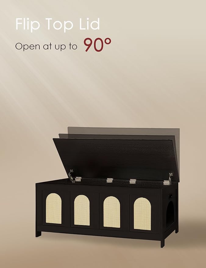 - 【Sturdy, Great Capacity】The enclosed litter box is crafted from top-notch engineered wood and rattan-like decoration. 2 Safety hinges hold the lid open and close slowly and smoothly. Spacious wooden litter box comes with 2 large cat entrance on both ends, even fits big fat orange cats to enter and exit freely