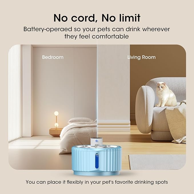 - Wireless Battery Operated Design: Say goodbye to tangled cords, allowing your pet to enjoy fresh, clean water anywhere. Effective preventing pets from biting on wires. You can place it flexibly in your pet's favorite drinking spots