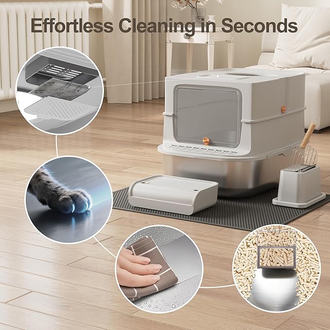 - 😽💟【Odor-Free & Premium Stainless Steel】Made from premium stainless steel, this top entry litter box resists odors and rust. A top carbon filter further traps smells, and the enclosed design maintains freshness, making this cat litter box stainless steel perfect for small spaces.
