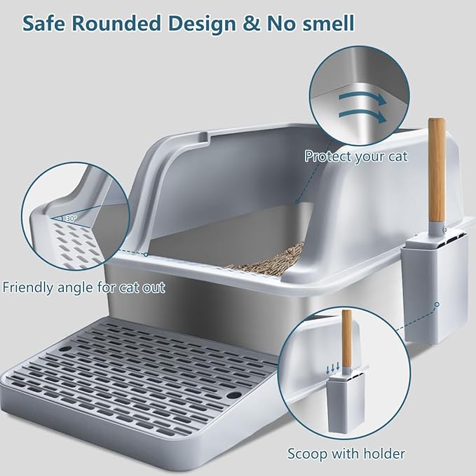 - 【Stainless Steel Cat Litter Box】: Stainless steel raw material prevent scratching by cat paws,non-porous nature feature is different from plastic, the stainless steel litter box will not collect any residue or odor, durable & rust resistant, extend the service life ,reduce the frequency of replacement;