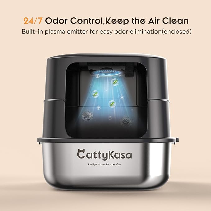 - 【Odor Control】Odor Control stainless cat litter box features plasma generator that eliminate odors.This stainless steel litter box with lid can adjusts deodorization intensity (Mode 1 for single-cat homes, Mode 2 for two cats, Mode 3 for 3+ cats), ensuring 90% odor elimination.
