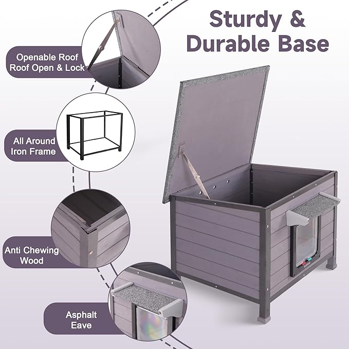 - 【Sturdy Cat House Base】Our outdoor cat house is constructed with solid wood and a metal frame. The fully enclosed metal frame is designed to prevent chewing and damage by pets. The use of durable materials ensures that the outdoor cat shelter is long-lasting and provides a safe and warm shelter for cats, dogs and other animals.
