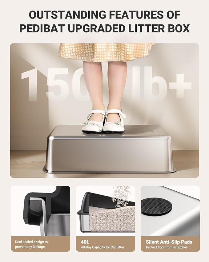 - 【Sturdy Stainless Steel Construction】:The metal litter box is made of premium stainless steel, the thickened stainless steel basin is scratch resistant and durable for your naughty furry children; the non-porous nature of the stainless steel litter box also prevents odor stagnation, providing a pure litter environment for your feline friends.