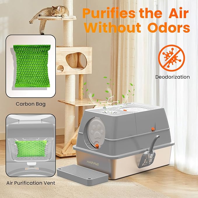 - Odor-Free: The carbon bag at the top vent of the stainless steel litter box effectively absorb odors, which keep your space clean and fresh.