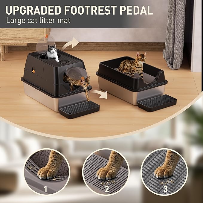- 【100% Premium Thick Stainless Steel】Crafted from high-quality, rust-proof stainless steel, our cat litter box is designed to resist scratches and features a non-stick surface for effortless cleaning. Its durable structure is strong enough to support an adult's weight, ensuring long-lasting reliability and superior performance. The enclosed design includes carbon filters that effectively absorb odors, maintaining a fresh and comfortable environment for your cat.