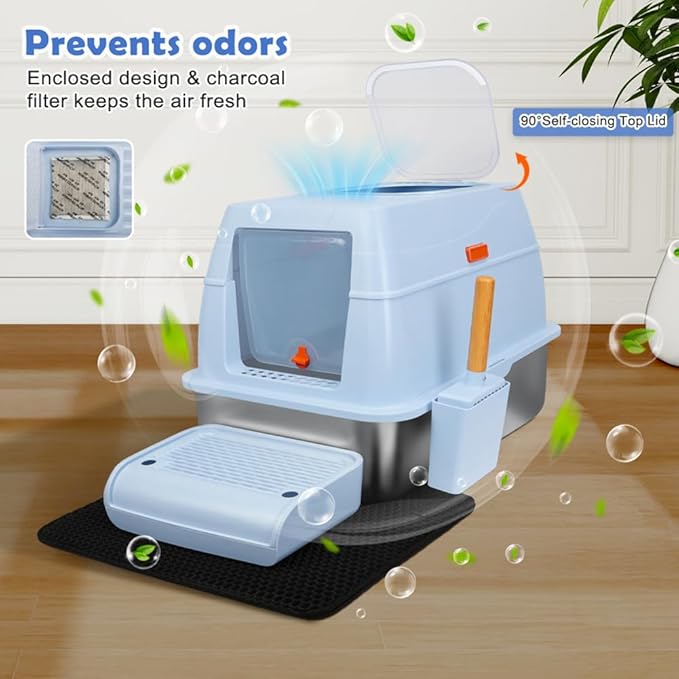 Vivifying Stainless Steel Litter Box with Lid, XL Front Entry Enclosed Extra Large Litter Box for Big Cats & Kitty, Top Exit Metal Cat Pan with Scoop, Mat, Step, Charcoal Filter (Blue)