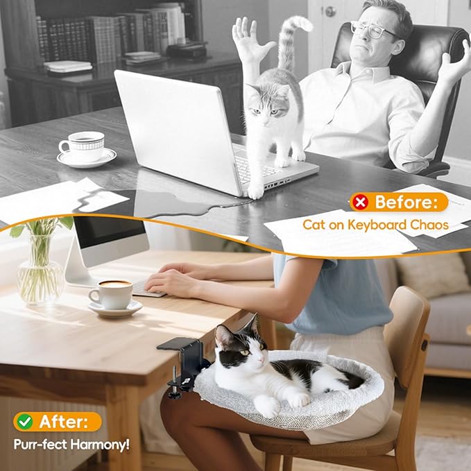 - Purrfect Work Buddy Setup – Replaces bulky cat trees. This desk mounted cat bed keeps cats off keyboards while bonding during office hours, offering a cat perch for desk convenience.