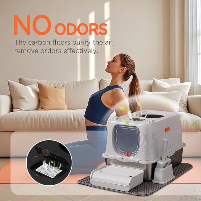 - 【Odor-Free Enclosed Litter Boxes with Carbon Filters】Equipped with carbon filters, this enclosed litter box effectively neutralizes odors, keeping your home fresh. Its sealed design provides privacy and cleanliness for your cat.