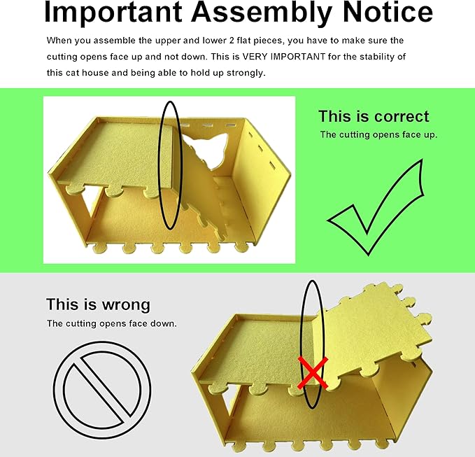 - EASY ASSEMBLY & EASY CLEANING: The assembly is very easy and straightforward with the interlocking design to ensure its stability. Make sure when you assemble this cat house, follow each step and the cutting lines face up to insure its stablility. At the same time, it's easy to clean using sticky rolls.