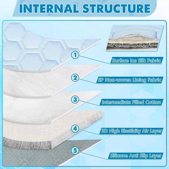 - 【Self-Cooling Material】: SISROL dog cooling mat features self-cooling fabric that cools automatically, needing no water, electricity, or fridge. The pet cooling pad for dogs or cats quickly absorbs heat, dropping the surface temp by 3-5°C (5-9°F). The ice silk surface feels cool and comfortable, the mesh bottom ensures good airflow for a dry pet, and the silicone dot prevents slipping, allowing your pet to step and lie safely.