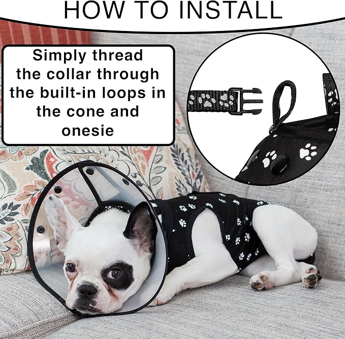 Cat Recovery Cone Kit Post Surgical Soft Pet Vest, Collar, and Non-Irritating Protection Cone for Cats - Comfortable Injury Care Solution (Black with White Paws, Small)