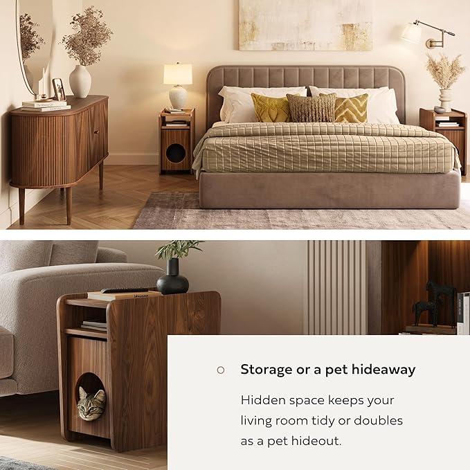 - ENJOY DUAL-PURPOSE FUNCTIONALITY as this versatile piece works not only as a cozy cat cubby but also as a practical side table. The smooth top and shelf provide room for a lamp, books, or décor, while the built-in magazine holder helps keep your essentials organized. With its compact footprint (11.8'' W x 22.2’’ H x 23.5’’ D), this wooden cat side table is ideal for living spaces where every inch counts.