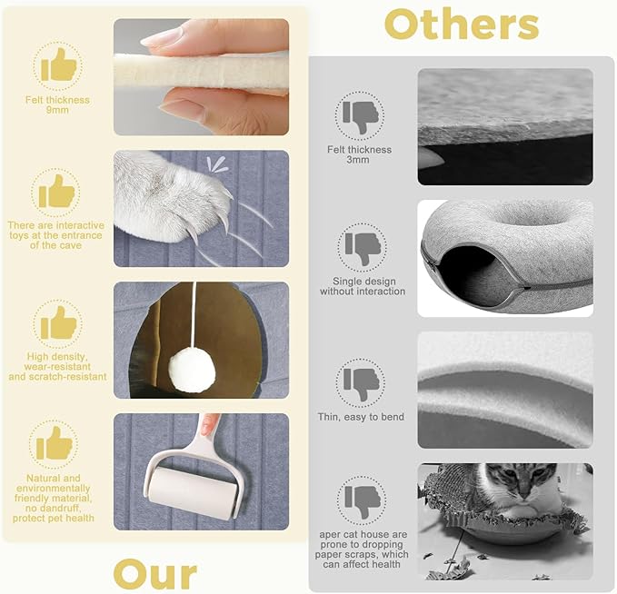 - Security & Scratch-Proof Durability: The cat bed cave house is made of abrasion-resistant felt with a tear-resistant process that defuses the impact of cat scratching and reduces paw pad friction. The felt mimics the texture of tree bark to stimulate your cat's primal desire to scratch. Additionally, the felt material offers insulation, warmth, and soundproofing features. The dense nature of thick felt helps dampen sound, catering to cats' territorial nature, creating a quiet, private space they may appreciate