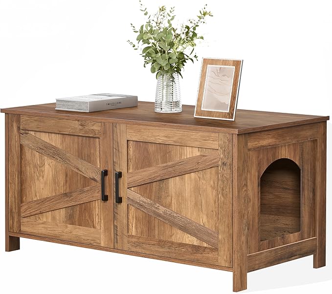 Homhedy 39.4" L Cat Litter Box Enclosure, Pet House with Barn Door,Wooden Cat Washroom Furniture,Fit Most of Litter Box, Rustic Walnut