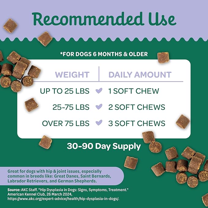 - MAY RELIEVE AND EASE JOINT PAIN – Helps reduce inflammation and ease discomfort from arthritis, hip dysplasia, and age-related joint issues – while also serving as a daily preventative for active dogs.