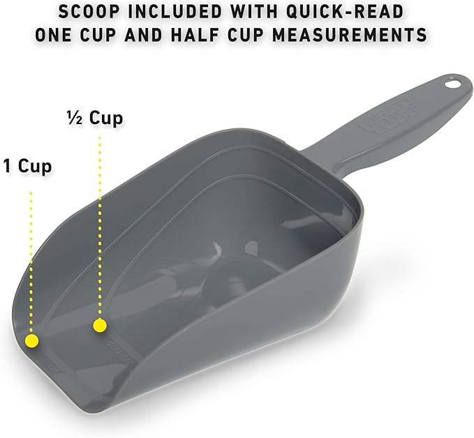 - VERSATILE: Suitable for storing dog food, cat food, bird seed, or other pet supplies, includes portion scoop with 1/2 and 1 cup markings