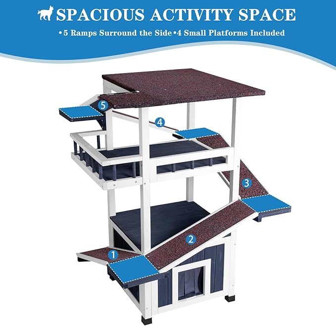 - Multi-Cat Playground: Engineered with 5 connecting ramps and 4 lookout perches, 2 large balconnies, this outdoor cat enclosure turns your backyard into an adventure zone where 3+ cats can climb, nap, and play tag without crowding
