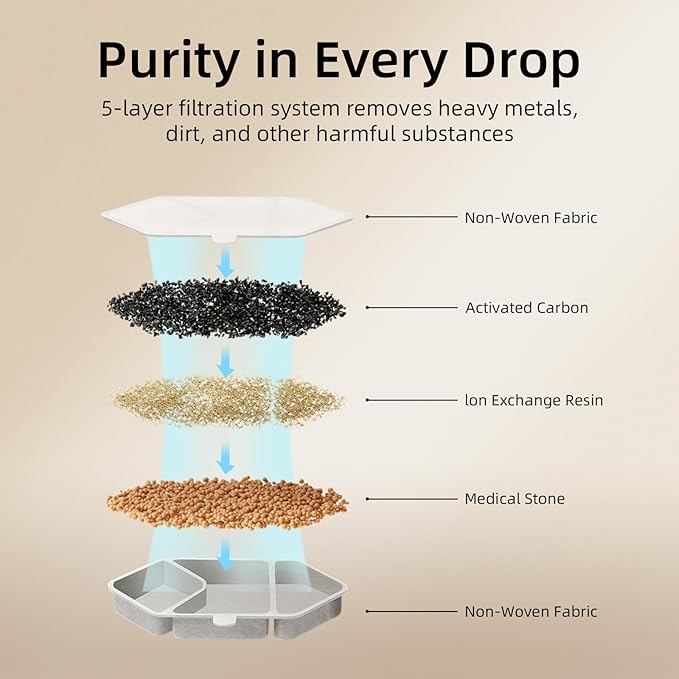 - 5-Layer Filtration System - 1. Activated carbon eliminates foul odors 2. Ion exchange resin removes heavy metal ions and softens water quality 3.Medical stone removes heavy metals and releases trace elements 4. The non-woven fabric captures cats' hair and impurities 5. The built-in pump sponge further filters debris to prevent blockages and damage.