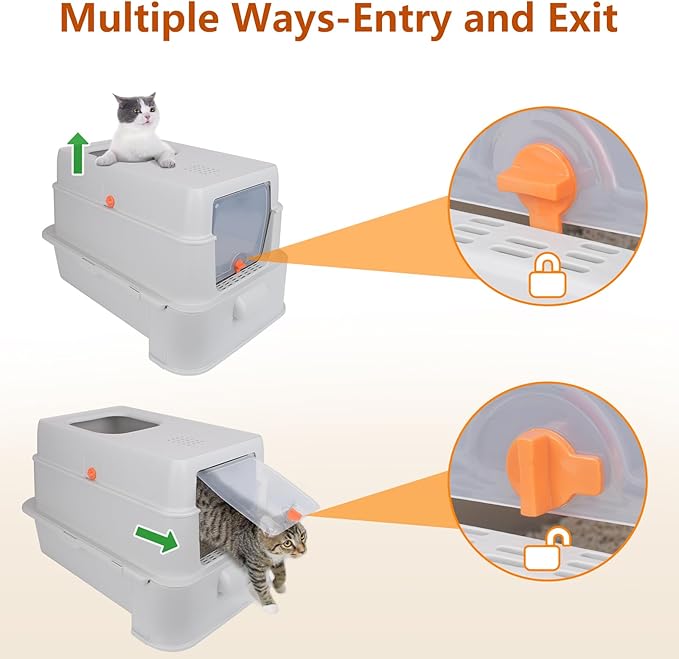 - 【Multiple Ways-Entry and Exit】Stainless steel litter box with lid has a front entry&exit and top exit design,rotate the front door button for a variety of options to suit your cat's preferences.Top exit effectively prevents litter from spilling out. If your cat doesn't like to use the top exit, you can keep the front door button open and it can use the front door. Come with a litter mat,keep your house clean and tidy.