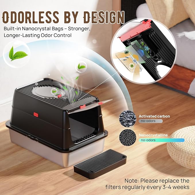 - Built-In Carbon Filter Pouch: Tired of that stubborn litter box smell? Our stainless steel litter box reduces odors proactively! The secret? An innovative flip-top lid with a dedicated compartment for our premium Nanocrystal Carbon Filters (includes FREE starter pack!). When it’s time to refresh (every 3-4 weeks), just flip open the lid, swap the filter, and you’re done!