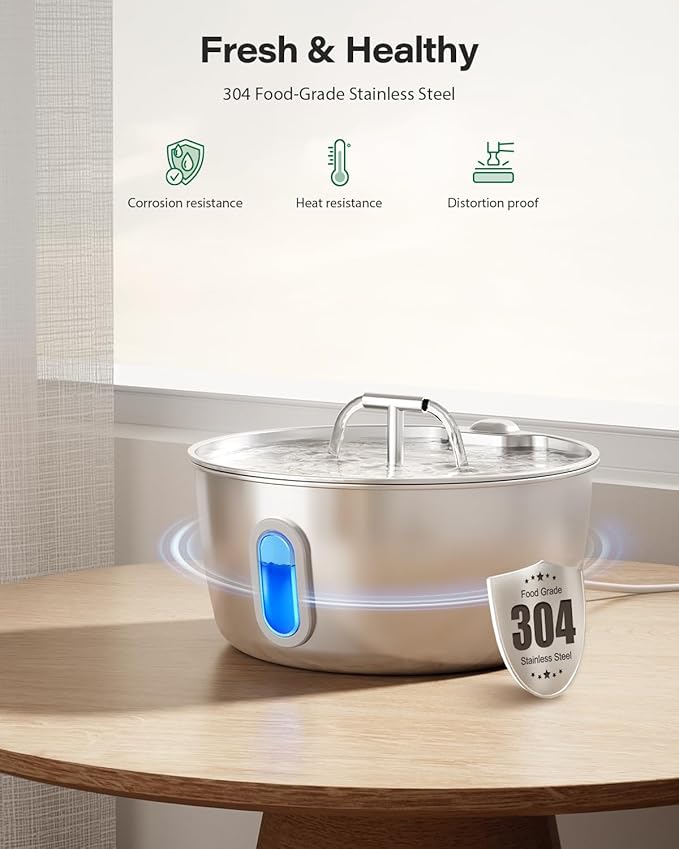 - Water Level Window & Stainless Steel: Designed with a visible water level window, allowing you to monitor water levels at a glance without opening the lid. Made from 304 stainless steel, this pet fountain is corrosion-resistant and supports high-temperature cleaning, helping maintain fresh drinking water for your pet