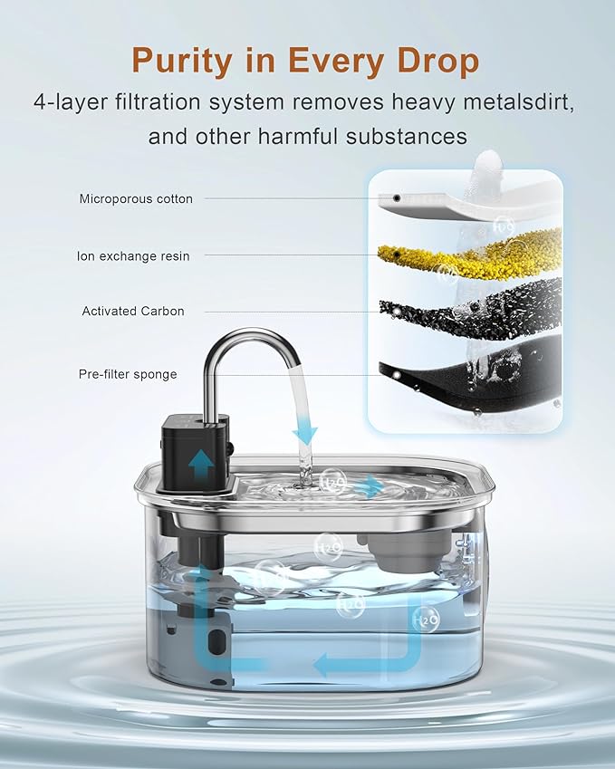 - [Transparent Water Level Window] The wireless cat water fountain has a capacity of 3.2 liters and is equipped with a transparent water level window, which makes it easy to observe the water level of the stainless steel cat water fountain and helps to refill the water in time.