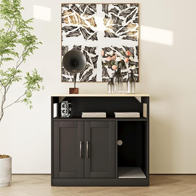 - Product Size: The dimensions are 31.1 "W x 19.7" D x 28.7 "H. This multifunctional cat furniture is large enough to accommodate most cat litter boxes on the market, and the entrance channel (9.4" W * 19.7 "H) is suitable for most cats to enter and exit. There is an additional semi enclosed storage space above the cat cabinet, providing more storage space for cat supplies such as cat food, cat toys, and other items