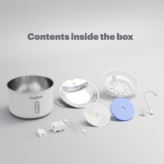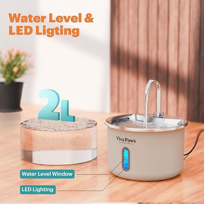 Viva Paws Cat Water Fountain Stainless Steel – Ultra-Quiet Automatic Drinking Fountain for Cats, 2.2L Indoor Pet Fountain with 4-Stage Filtration for Fresh & Clean Water