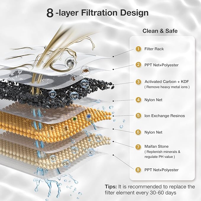 - Efficient 8-Layer Filtration: The pet water fountain features advanced filtration using KDF material, ion exchange resin, mineral ceramic balls and activated carbon found in household water purifiers. This effectively removes impurities, softens and purifies water and eliminates odors and inhibits biofilm.APP will remind the cartridge life.The filter lifespan is 30 to 60 days (depending on the selected water flow mode)