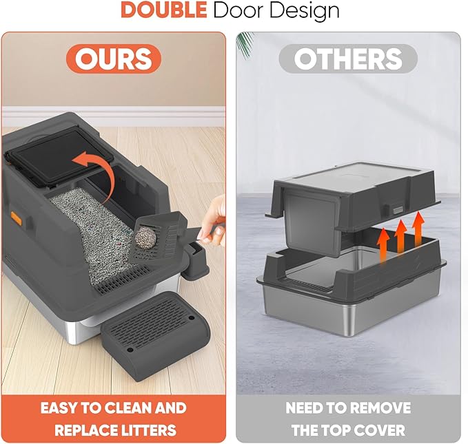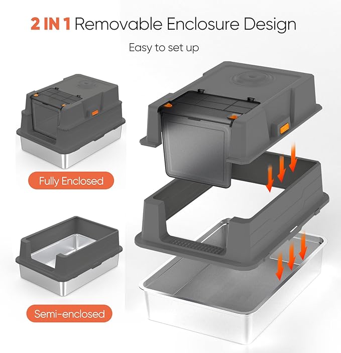 - 【FULLY ENCLOSED, SEMI-ENCLOSED AND FULLY OPEN】 our stainless steel cat litter box features an easy-to-assemble, 3-layer detachable shell that offers fully enclosed and semi-enclosed and fully open configurations. the fully enclosed mode can prevent the spread of odors and protect your cat from interference from other pets, while the fully open mode can promote ventilation the semi-enclosed make cleaning more convenient.