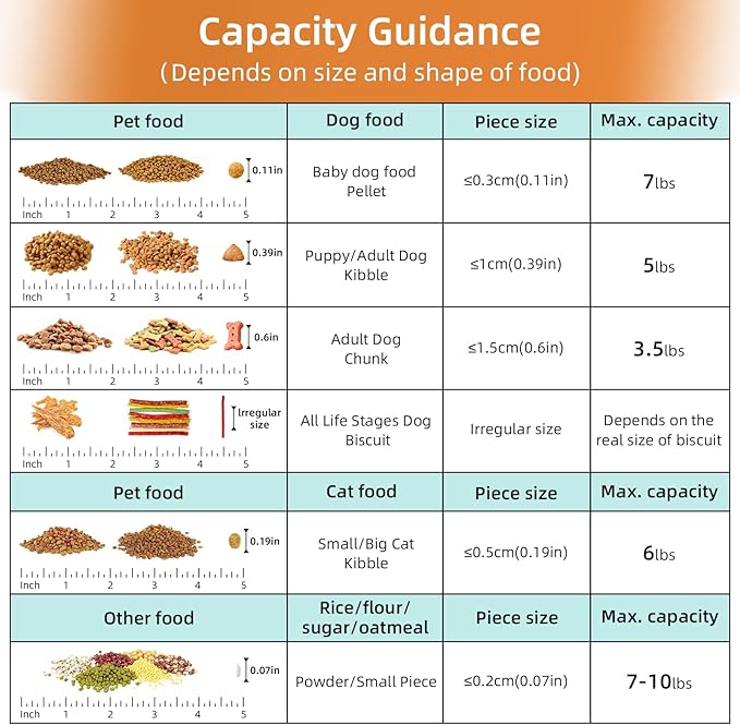 - CAPACITY : Pet dry food storage containers (size and size combination)-our cat food storage container combination capacity is 12 LBS(large pet container is 5-7LBS,small rice container is 3-5LBS) and can hold approximately 10-15 pounds of pet food.It also works well with regular kitchen food.Such as rice,flour,cereal,beans,nuts,snacks or whatever you like