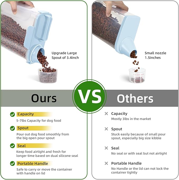 - BENEFITS : Upgraded Large Pour Spout with Measuring Cup-We upgraded the mold so that the pour spout is large enough to pour out large dog food.You can now pour food easily and quickly.The newly upgraded measuring cup can now also be easily screwed onto the nozzle
