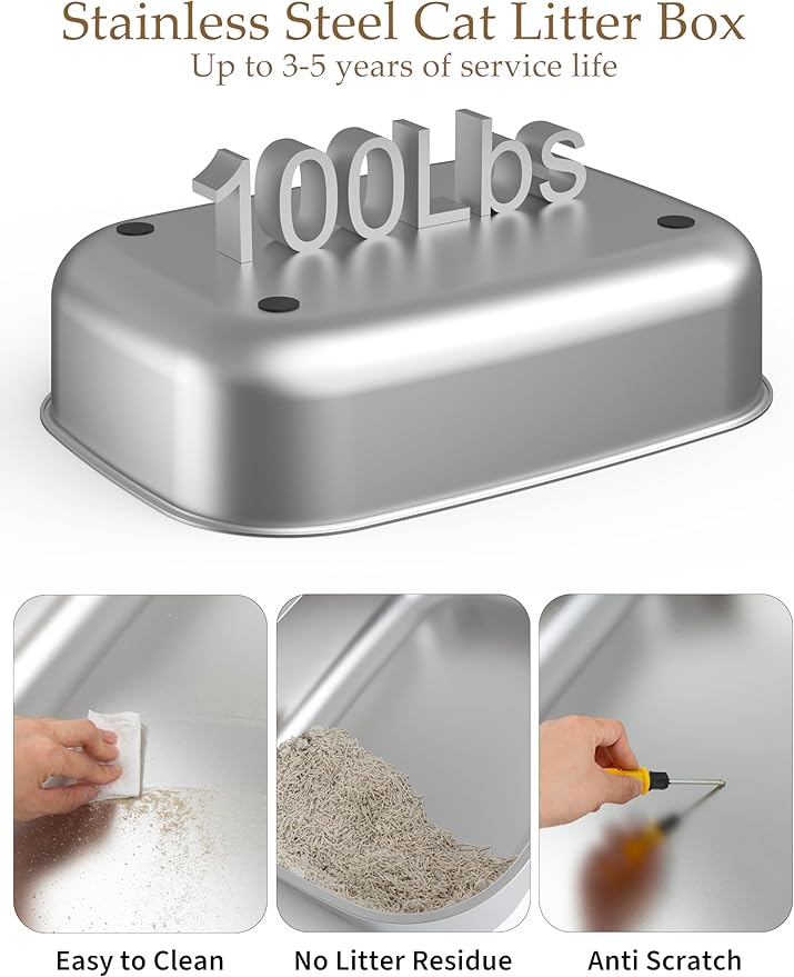 - Leak-Proof Stainless Steel Design: Say goodbye to messy spills; Our upgraded stainless steel cat litter box features a 10-inch high dual-layer enclosure, an inverted panel, and an overlapping design that effectively contains urine inside the box, preventing leaks and splashes; Perfect for high-peeing cats and active diggers, this design keeps your home cleaner and fresher.