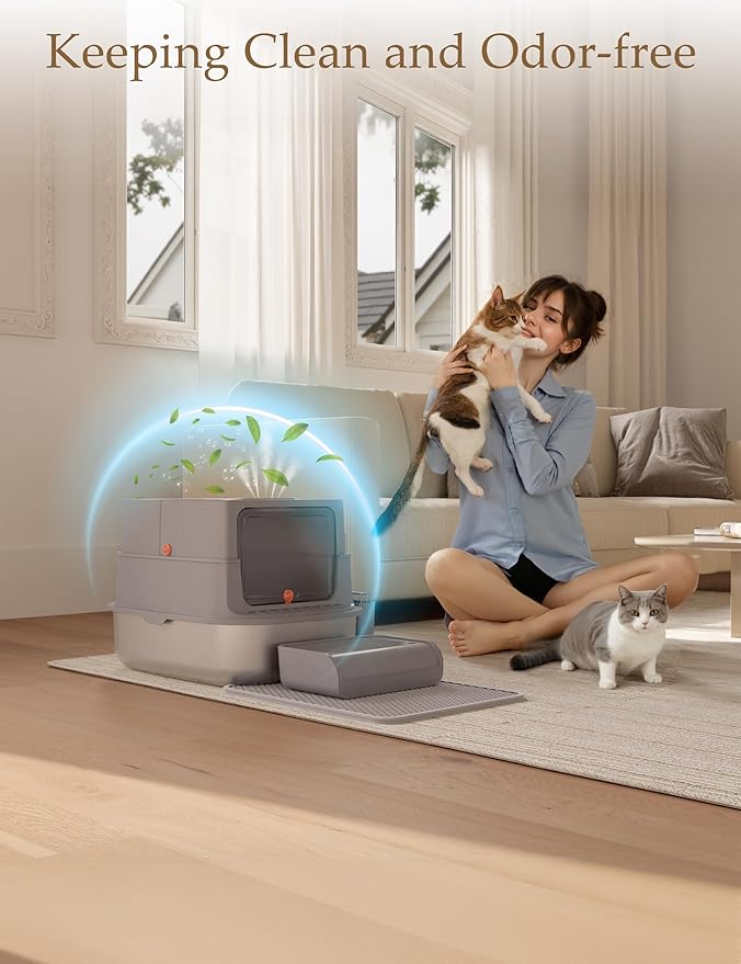 - Extra-Large & High Capacity: Measuring 23.6” x 16.3” x 16” with a 70L total capacity, this oversized litter box is ideal for cats weighing 1-30 lbs; The 6-inch deep stainless steel tray holds up to 30L of litter, lasting 15-20 days for a single adult cat, reducing the need for frequent litter changes; Spend less time maintaining the box and more time enjoying life with your pet.