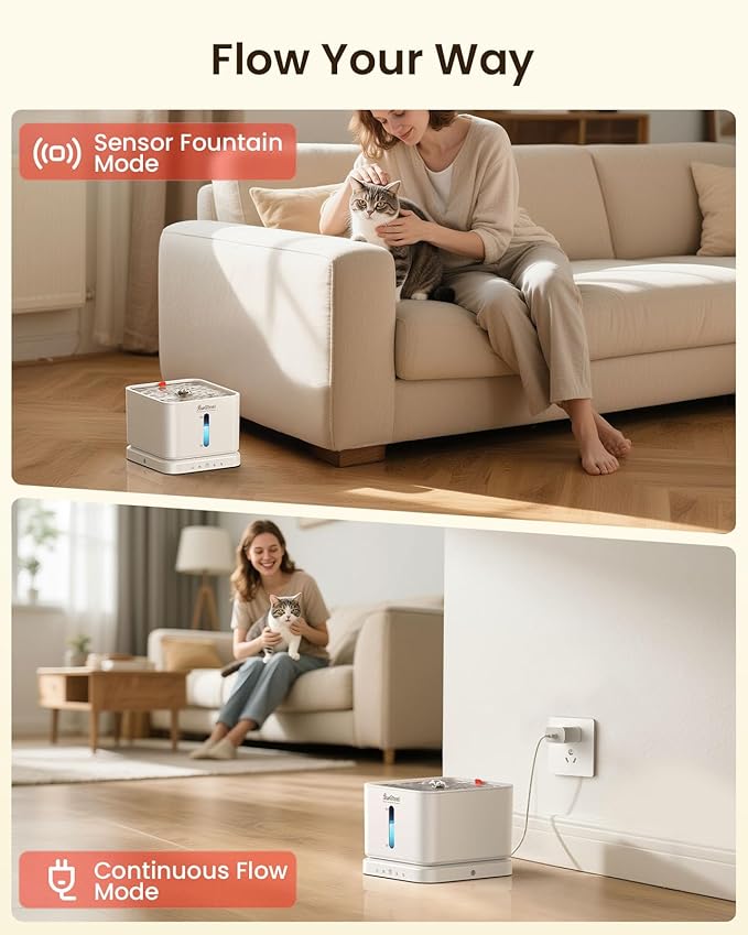 - Dual Water Modes - The cat water fountain now features a sensor fountain mode, equipped with three advanced radar sensors that search for your cat within a 270° 80-inch range, ensuring no drinking needs are missed. Additionally, you can use the continuous fountain mode by plugging it in for uninterrupted water supply.