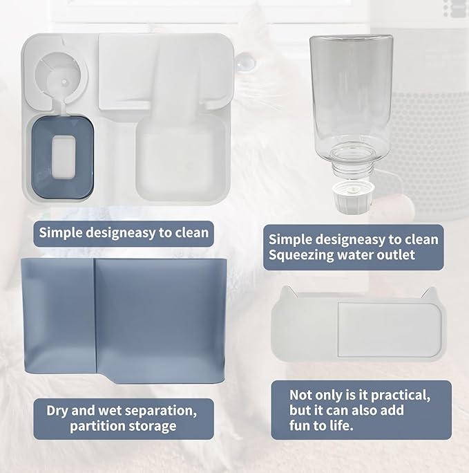 - 【Automatic feeding and water】: Our automatic cat food bowl will automatically dispense food and water after you add it. The storage capacity of the water tank is 1L, and the storage capacity of the grain tank is 1.5L. We have adopted a small mouth design for the storage capacity of the cat food bowl, which ensures that the amount stored each time is not too large to prevent pets from overeating. The water bowl adopts a segmented design and will stop discharging water after a certain water level to prevent the water from overflowing due to excessive water level.