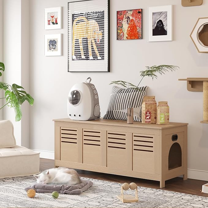 - 【All-in-1 Pet Furniture】As a cat litter box enclosure, it perfectly hides odors and scattered cat litter. As a cat house, it provides your cats a private and secure place. It can also be used as a storage cabinet to store cat supplies. Spacious top space can be used as a side table or bedside bench