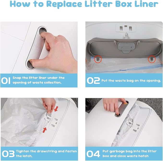 - EASY TO INSTALL: For Petcpu cat litter box, open the waste collection compartment and put the rolled edges of liner on litter boxes. For the litter box liners, simply wrap the edges of the liner over the rim of the opening of waste storage and tighten the rope of the waste bag.