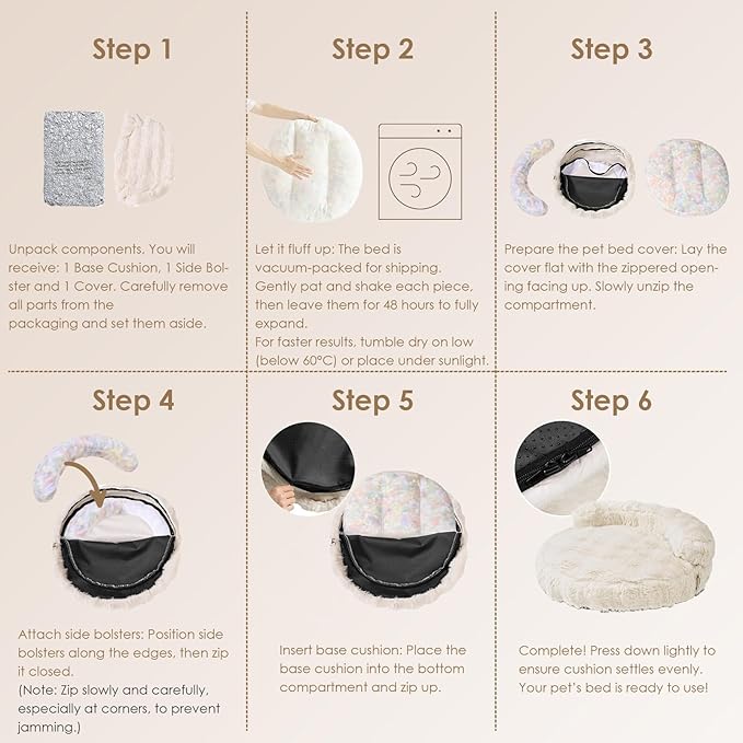 - QUICK FLUFF & RECOVERY: This dog bed for small dogs is vacuum-packed for shipping. After opening, simply pat, shake, and let it sit for 48 hours to fully fluff up. For quicker results, tumble dry on low (under 60°C), or leave it in the sun.