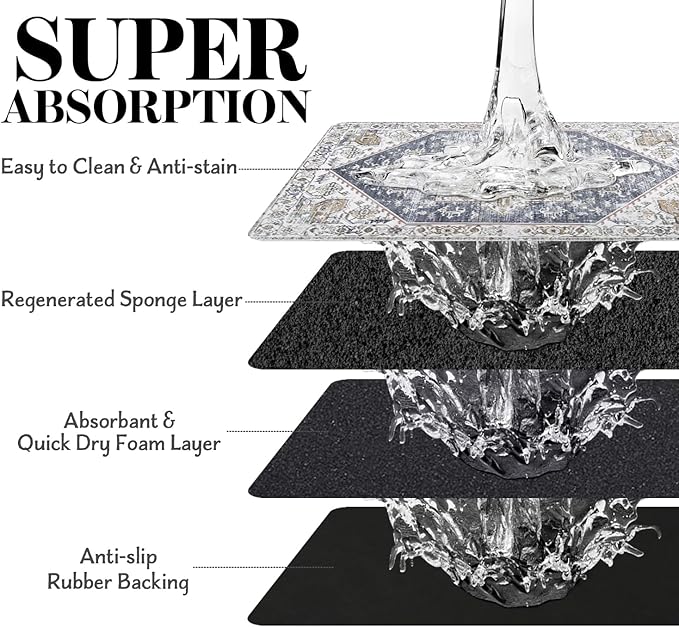 - Super Absorption: The dog mat for water bowl can absorb spilled water without leaving traces and dry quick, avoid wetting pet paws even for messy drinkers. And it does not attract pet hair like traditional silicone dog bowl mat.
