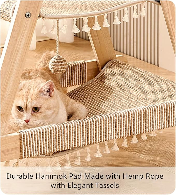 SHENGOCASE 3-Tier Modern A Frame Wooden Cat Tree Tower Ladder with Multi-Level Bed Hammock for Large Cat and Sctatching Post, Hanging Toy Ball (Beige)