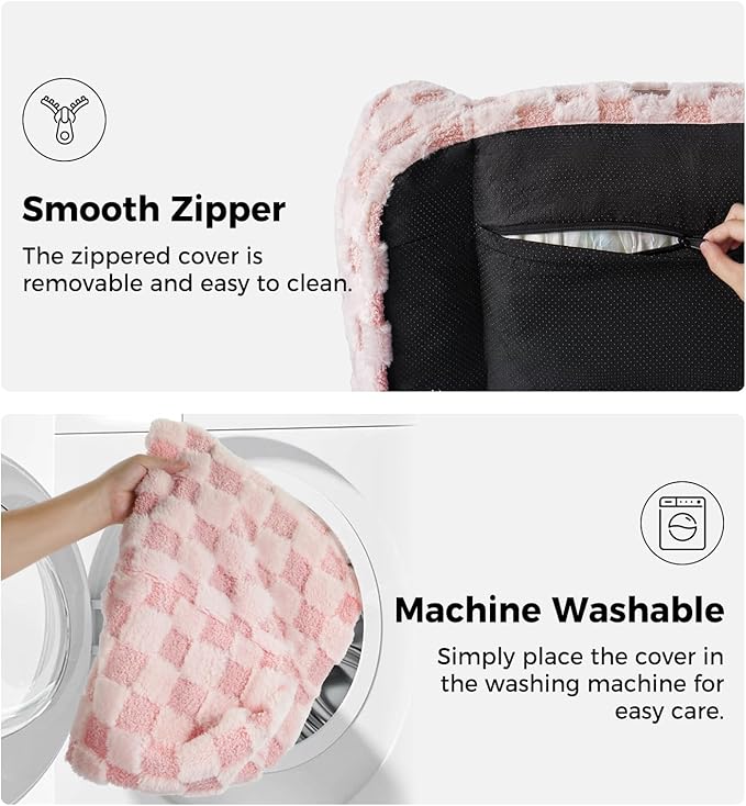 Made4Pets Cat and Dog Couch Bed, Soft Faux Fur Checkered Pet Sofa, Cozy Fluffy Pet Sofa with Supportive Foam, Removable Washable Cover with Non-Slip Base, Pink, Medium