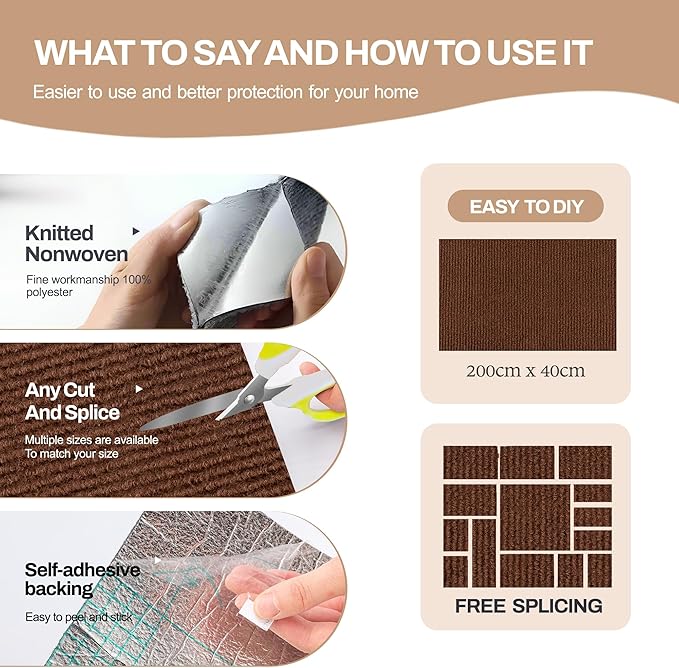 - 【Self-Adhesive Convenience】This cat carpet mat is designed with a self-adhesive backing that is securely fastened using an environmentally friendly adhesive. Simple to install, simply peel off the backing and stick it to the desired surface to ensure a secure, hassle-free fit and maintain a firm grip.We also have additional eco-friendly adhesive and screw nails to help you better choose the scenarios you want to use.