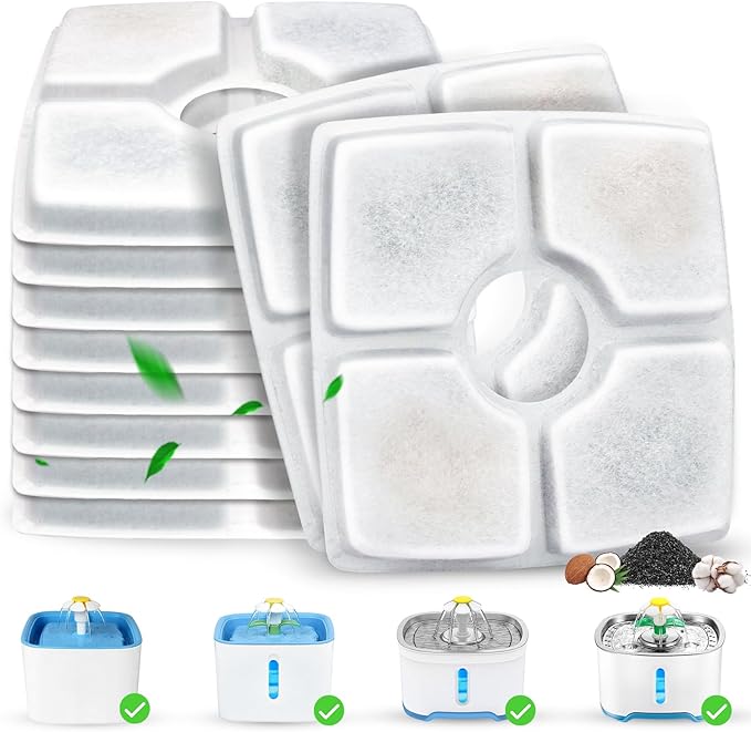 - 【10 Pack Filters Set】Beyolike premium cat fountain filters set includes 10 pcs replacement filters, triple filtration system square carbon filters for cat water fountain can effectively filters out food debris and pet hair, ensures fresh and clean drinking water for cat dog, keep your pet healthy.