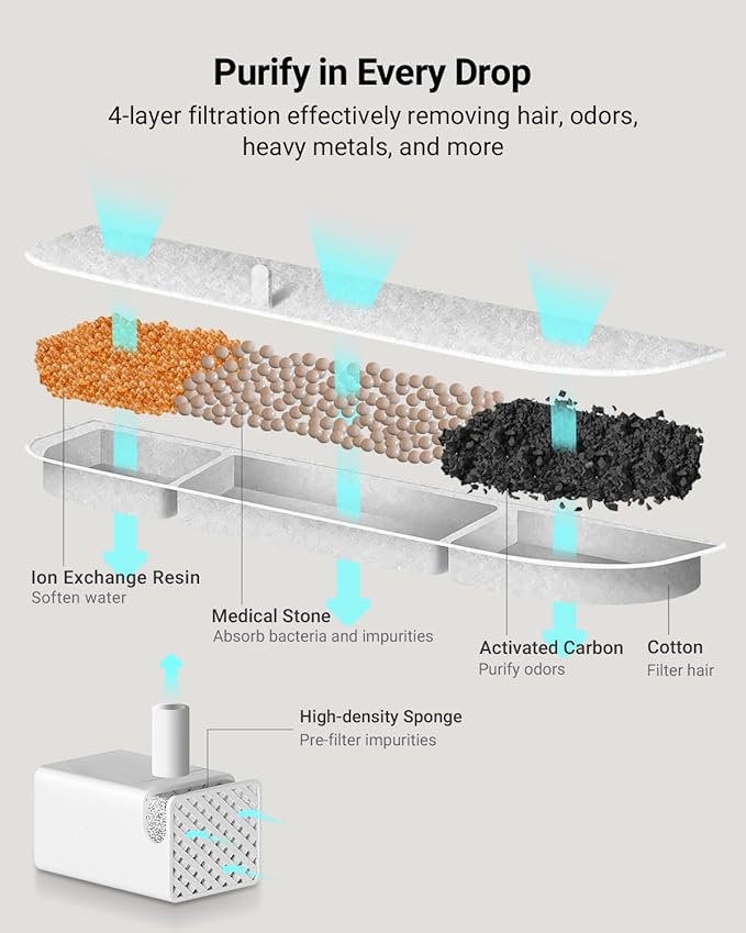 - Pet Health In Mind - Every drop of water is filtered through multi-layer filtration to remove all impurities and provide oxygen-enriched and better-tasting water
